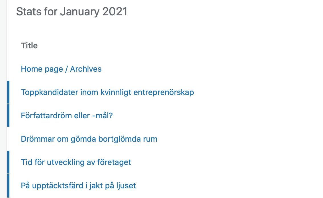 I topp ligger startsidan, inga konstigheter. Det mest populära inlägget är Toppkandidater inom kvinnligt entreprenörskap. Min gissning är att den hamnade i topp för att det handlar om Stiftelsen Maria Pihls minne och mitt Facebook-inlägg delades av grundaren Roger Pihl.
