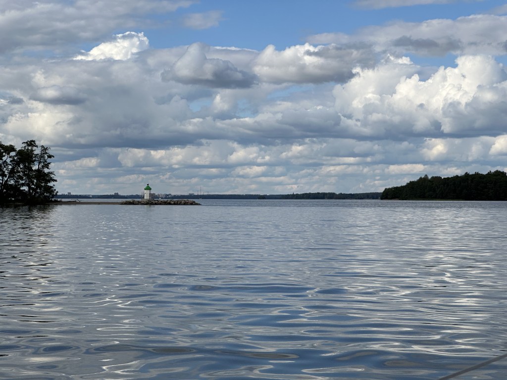 Strax efter klockan 9 lämnade vi Fagerön och hissade segel så snart vi kommit ut från land. Nu fick vi för första gången på semestern känna på lite hårdare vindar, omkring 6-8 m/s uppskattar jag och i vissa byar omkring 10 m/s. I full fart forsade vi över Granfjärden ner mot Björsund och Sundbyholm där det blev lite lugnare i de sydliga vindarna. Även över vår hemmafjärd, Blacken, gick det fort. Vi har inte fått till revet på storseglet än och det måste vi fixa till framtida turer för den här båten, Fabola Campus 7.4, är inte bekväm att segla när det friskar i. Man får kämpa för att hålla emot rodret och släpper man inte på skotet blir det stundtals svårt att styra. Men vi lär oss mer om hur vi ska trimma och segla båten varje gång vi är ute!