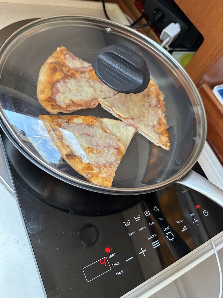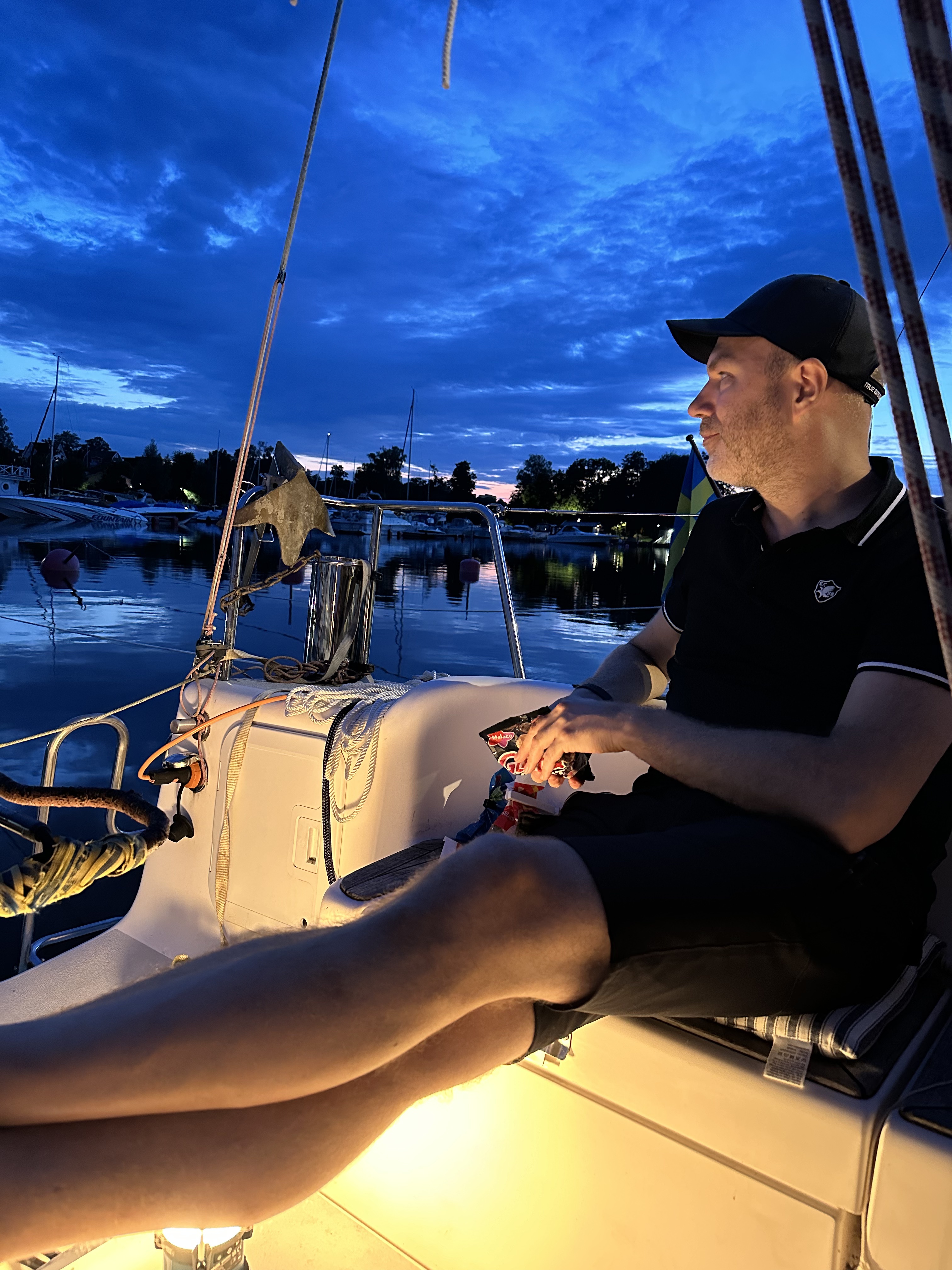Det blev middag i sittbrunnen med tacos för föräldrarna och pizzabitar (preppade hemma och det gick fint att värma i stekpanna med lock) till lilleman innan vi kröp till kojs för en lite stökig första natt. Vi låg tryggt och bra i hamnen, men som vanligt tar det någon natt för hela lilla familjen (mamma, pappa och 9-åring – tonåringarna stannar hemma) att bli vana vid att sova i båten.