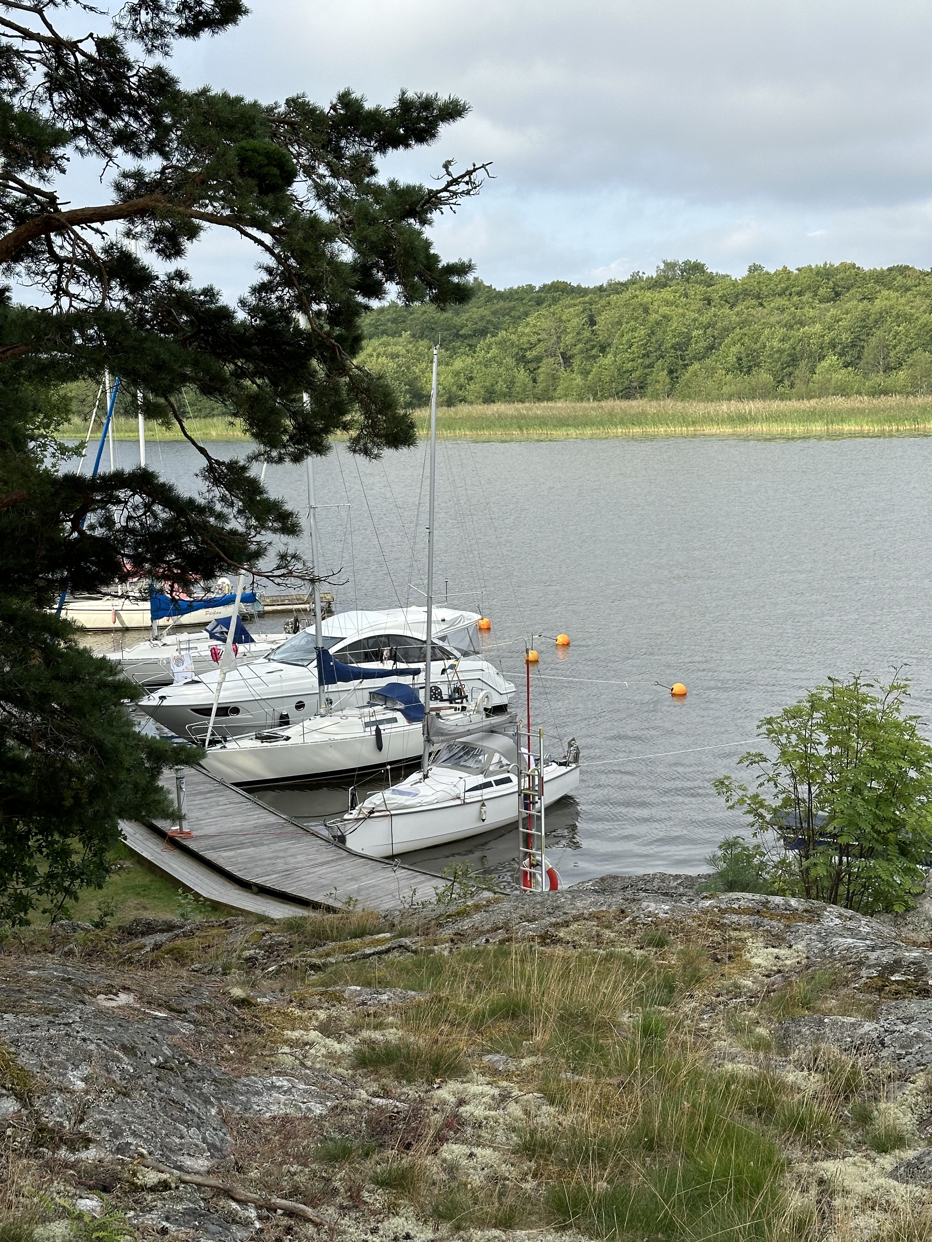 Eftersom det är en ganska stor ö så tänkte vi att vi skulle kunna ta en promenad, men precis innanför udden stod ett gäng kor och vi kände inte för att gå igenom flocken så vi vände tillbaka och simmade i viken istället. Fagerön är en del av naturreservatet Ängsö och i den här viken där vi låg finns en brygga och strax intill en eldstad och lite längre upp ett dass. Dasset gick tyvärr inte att använda eftersom i det ena båset satt ett stort getingbo och getingarna blev inte glada när vi öppnade dörren och i det andra båset var tunnan full. Vi har porta potti i båten, men den är av minsta modellen så finns det möjlighet att använda toalett eller dass i land så gör vi det, men nu fick vi skippa det och det gick såklart bra ändå.