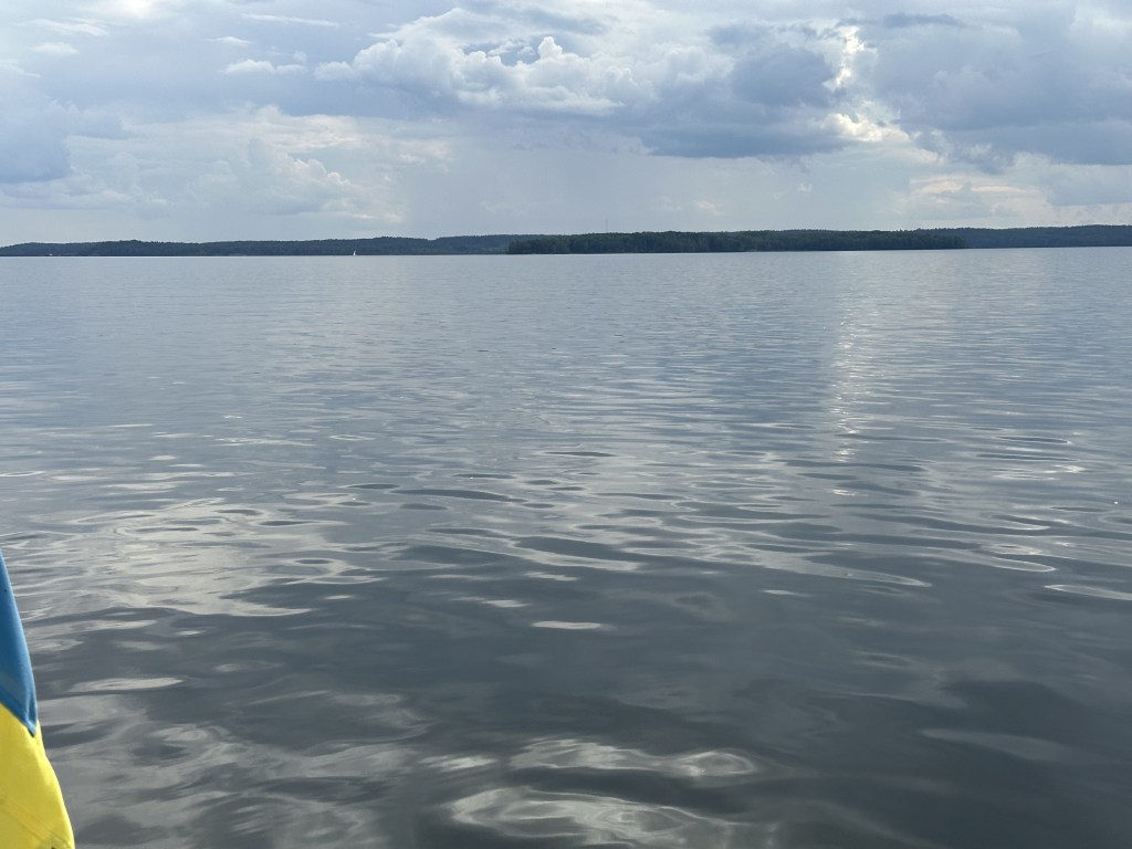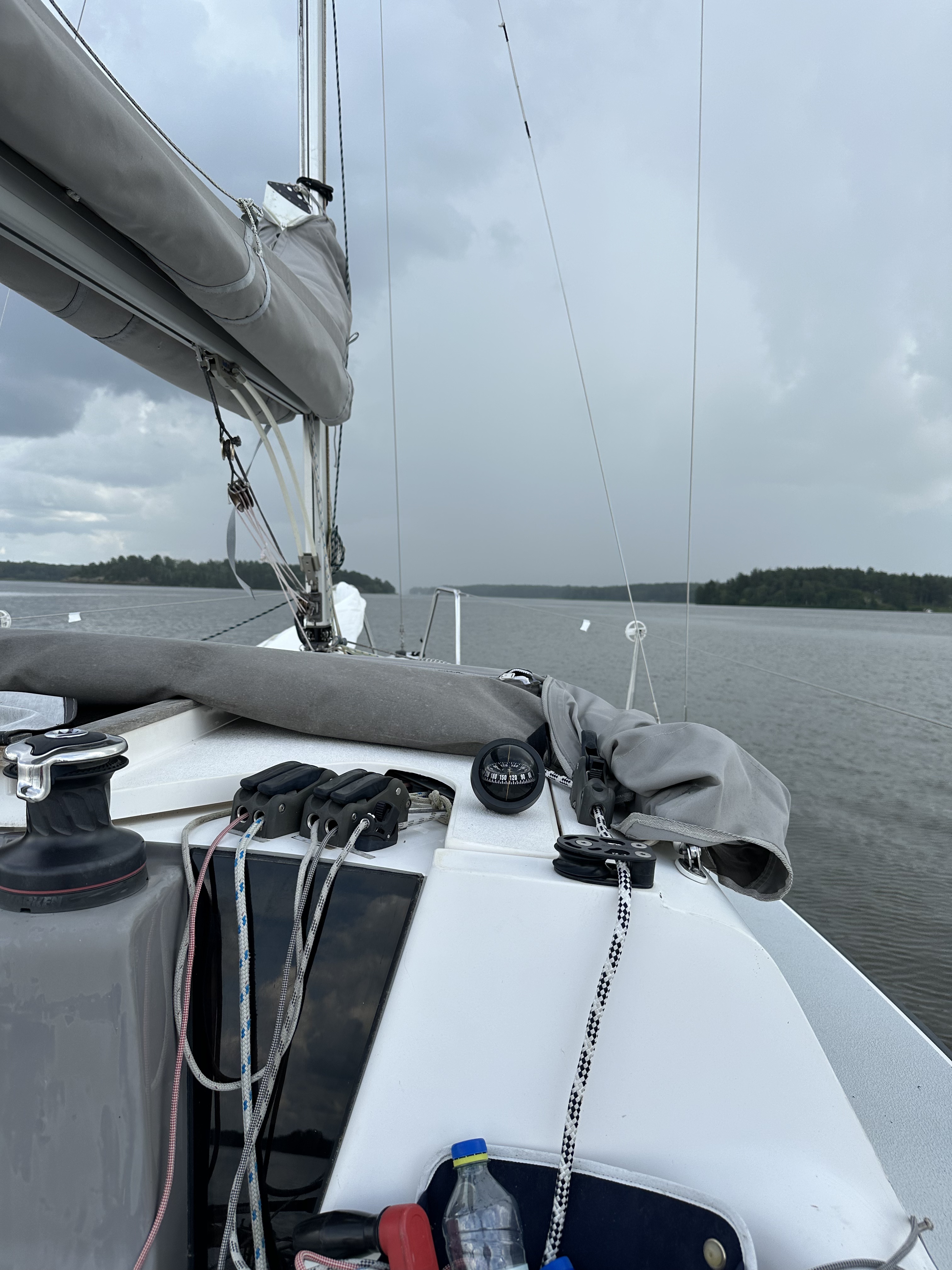 På söndagen tog vi sikte mot Strängnäs. Vi började med sol och svaga vindar över Granfjärden. Eftersom prognosen sa åska och vi såg ovädret över Sundbyholm och Torshälla valde vi att gå för motor med förhoppningen att lyckas dra ifrån molnen.