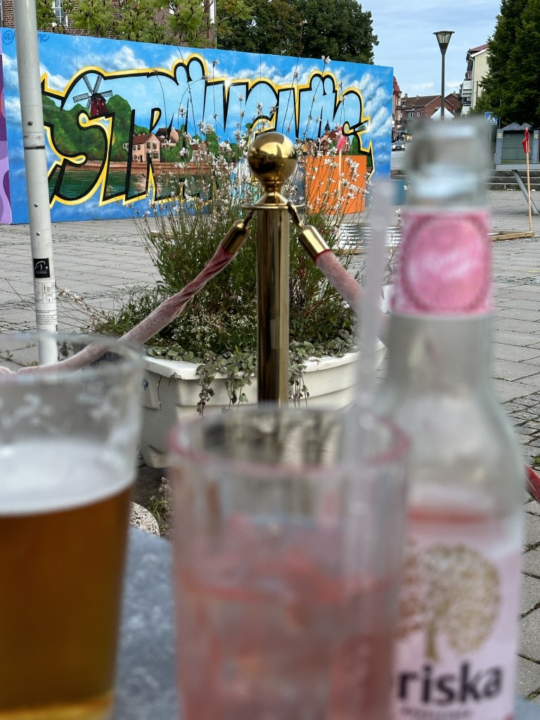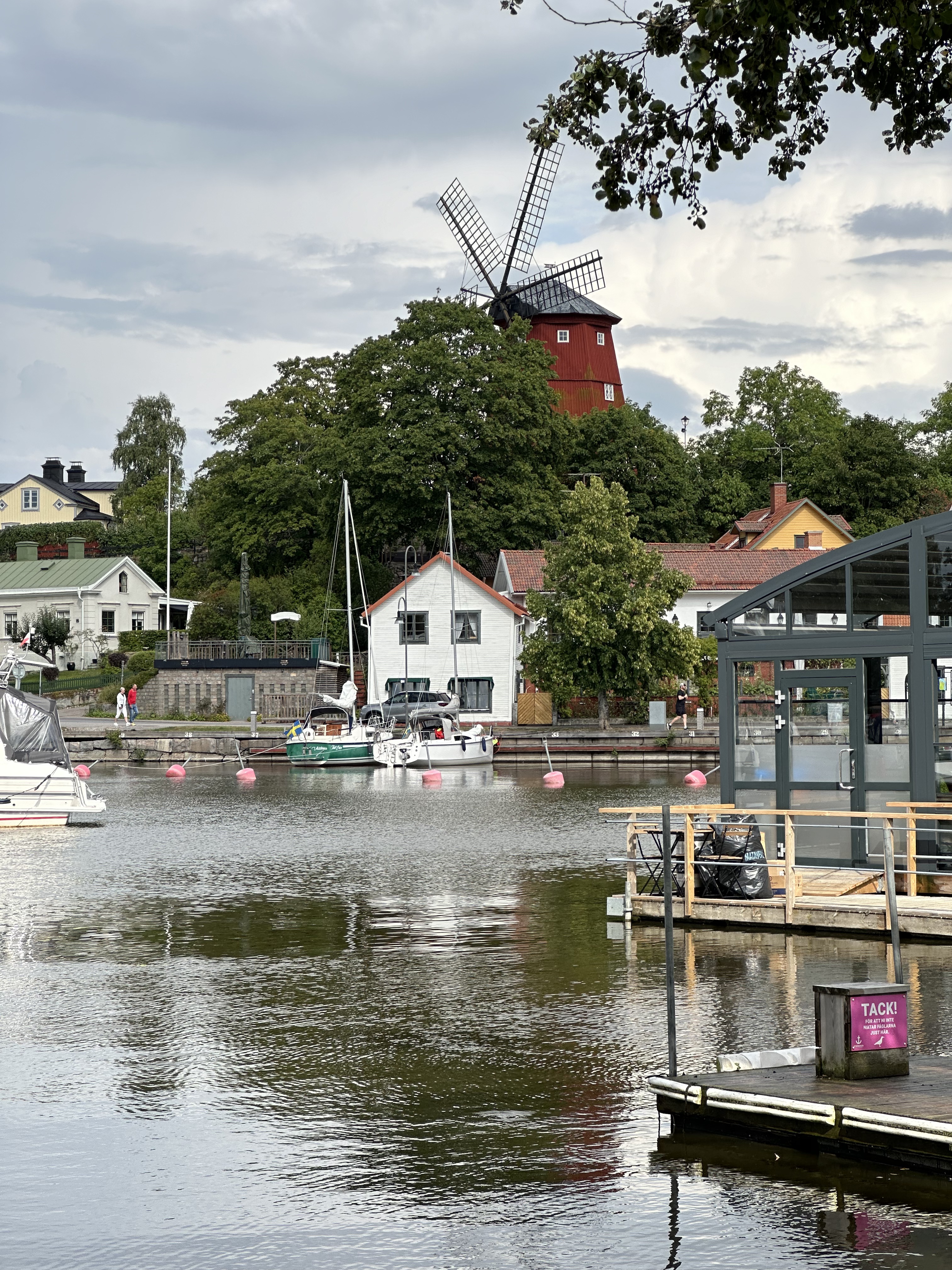Vi ville gärna komma någorlunda nära hemma till den sista natten, eftersom torsdagens väder inte såg så lovande ut. Vi vaknade tidigt och fixade lite nödvändigheter som vatten och sopor och tog också en promenad i staden för att se om Coop eller Ica hade öppnat, det hade de inte men vi fick med oss varsin Caesarsallad från Statoil, wraps till Magnus och lite annat smått och gott (sjön suger ni vet, och det är himla smidigt med färdigmat i hålla-i handen-vänlig förpackning när man seglar).