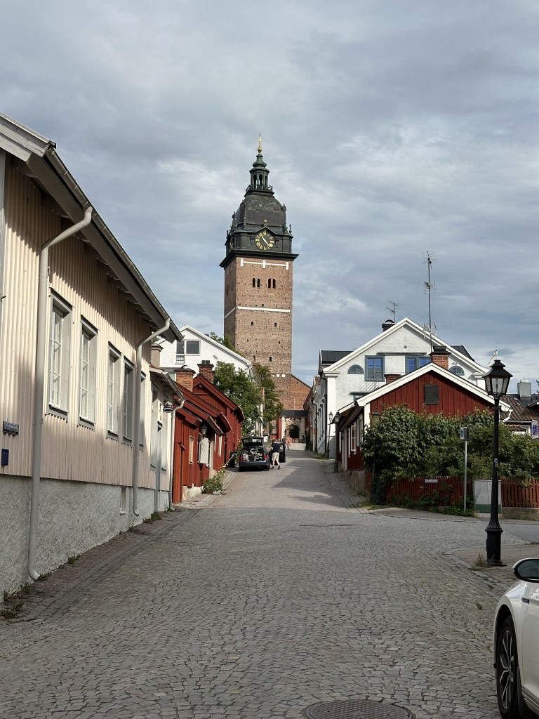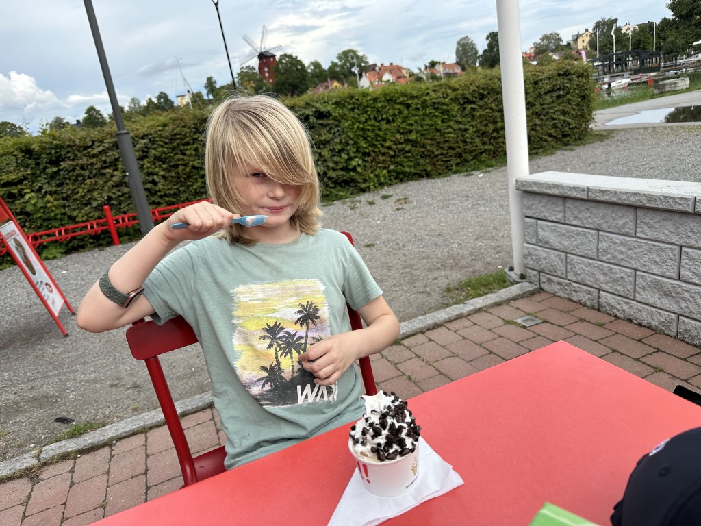 Måndagen började med att yngsta besättningsmedlemmen tyckte att det kunde räcka med seglingssemester och att det skulle vara roligare att vara några dagar hos farmor och farfar. Vi tog en promenad runt domkyrkan och väderkvarnen innan farmor och farfar kom med bil, sedan åt vi lunch och fikade på Grassagården tillsammans med dem.