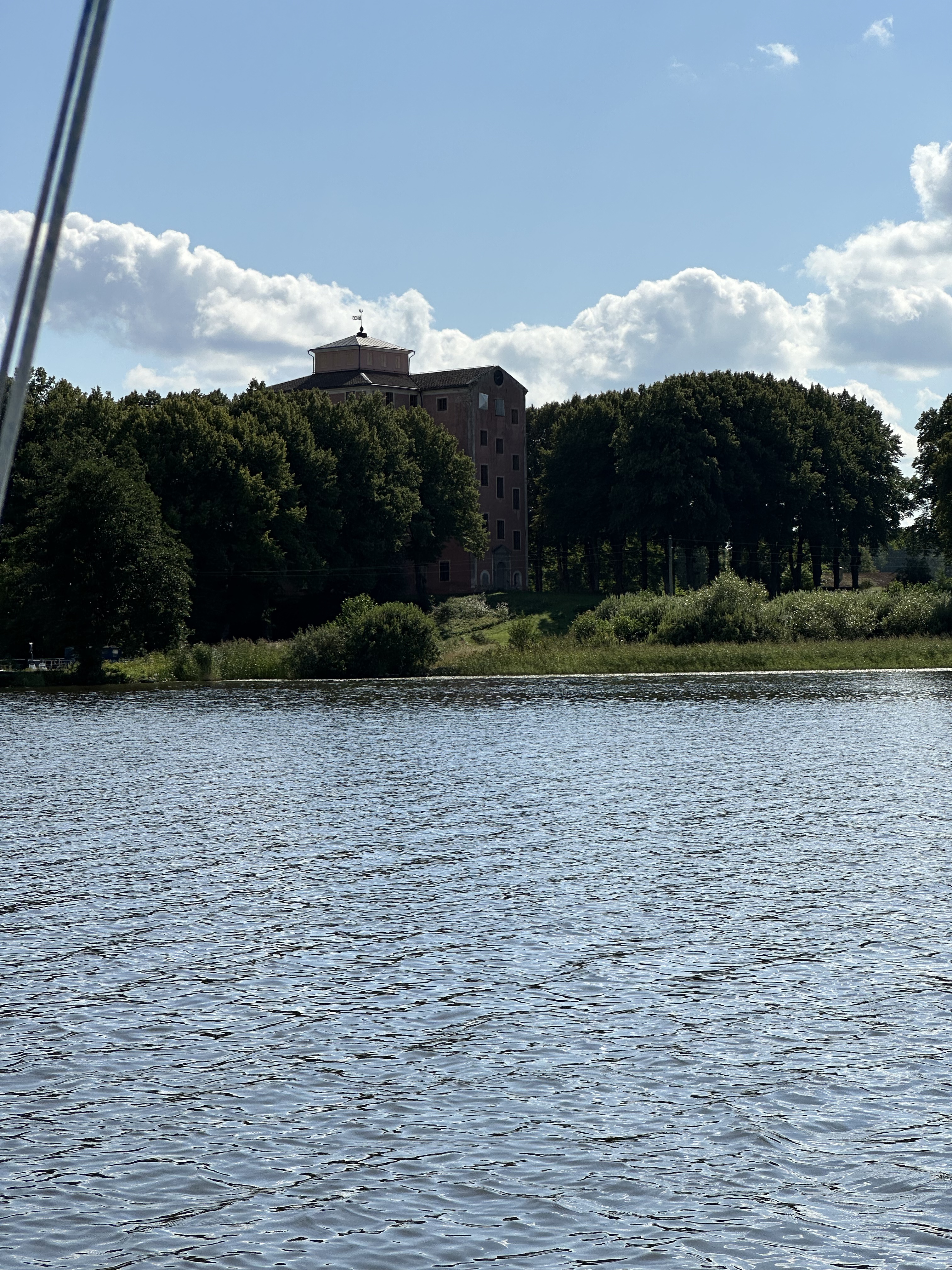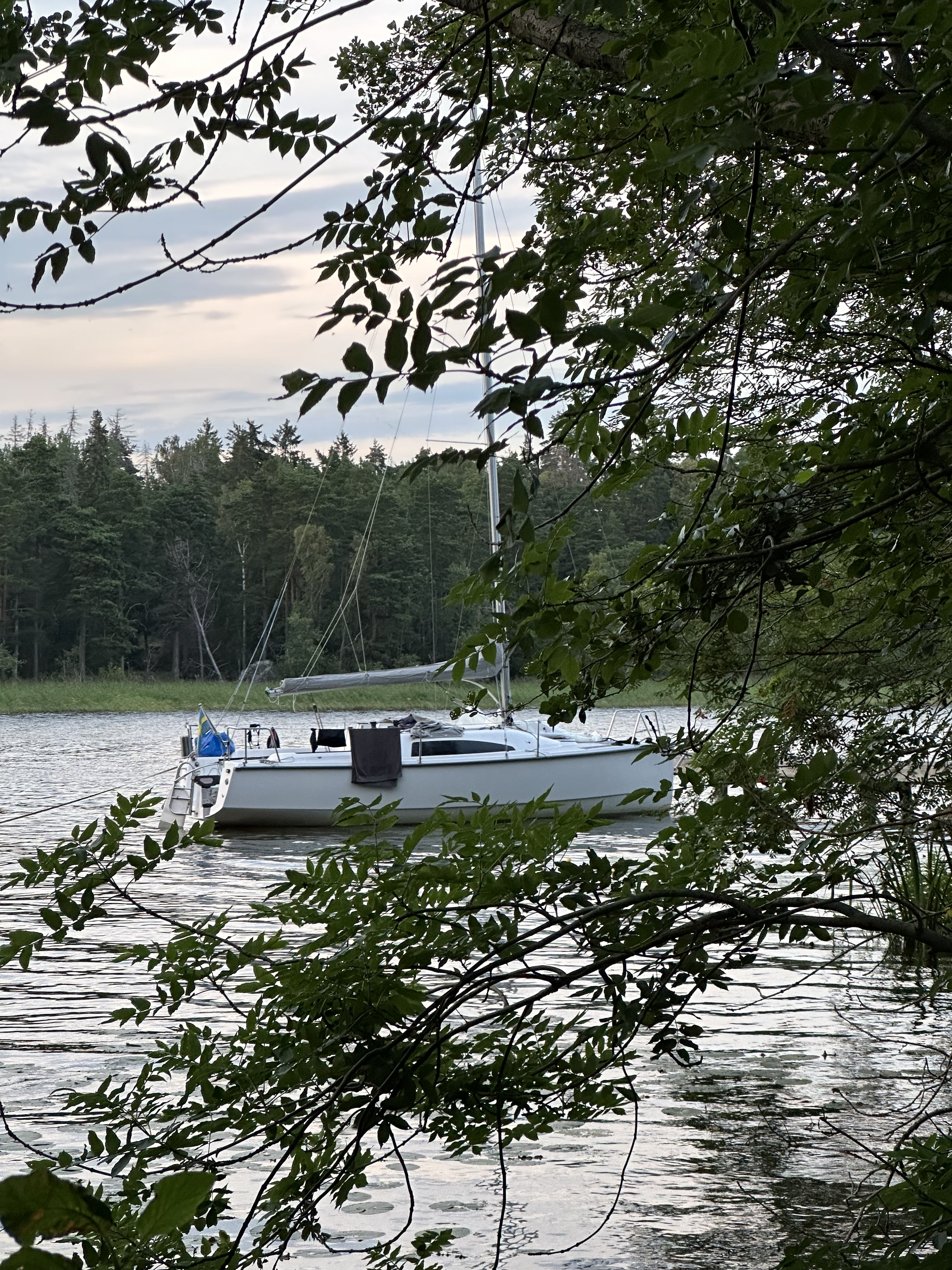 Därefter fortsatte vår långsamma färd mellan Tynnelsö och Selaön. Efter att vi passerat Tynnelsö slott drog vi upp seglen, mycket lätta vindar dock men fördelen med det var att det gick att doppa sig från badstegen utan att behöva stanna och ankra. Vi seglade i alla fall ett par timmar.