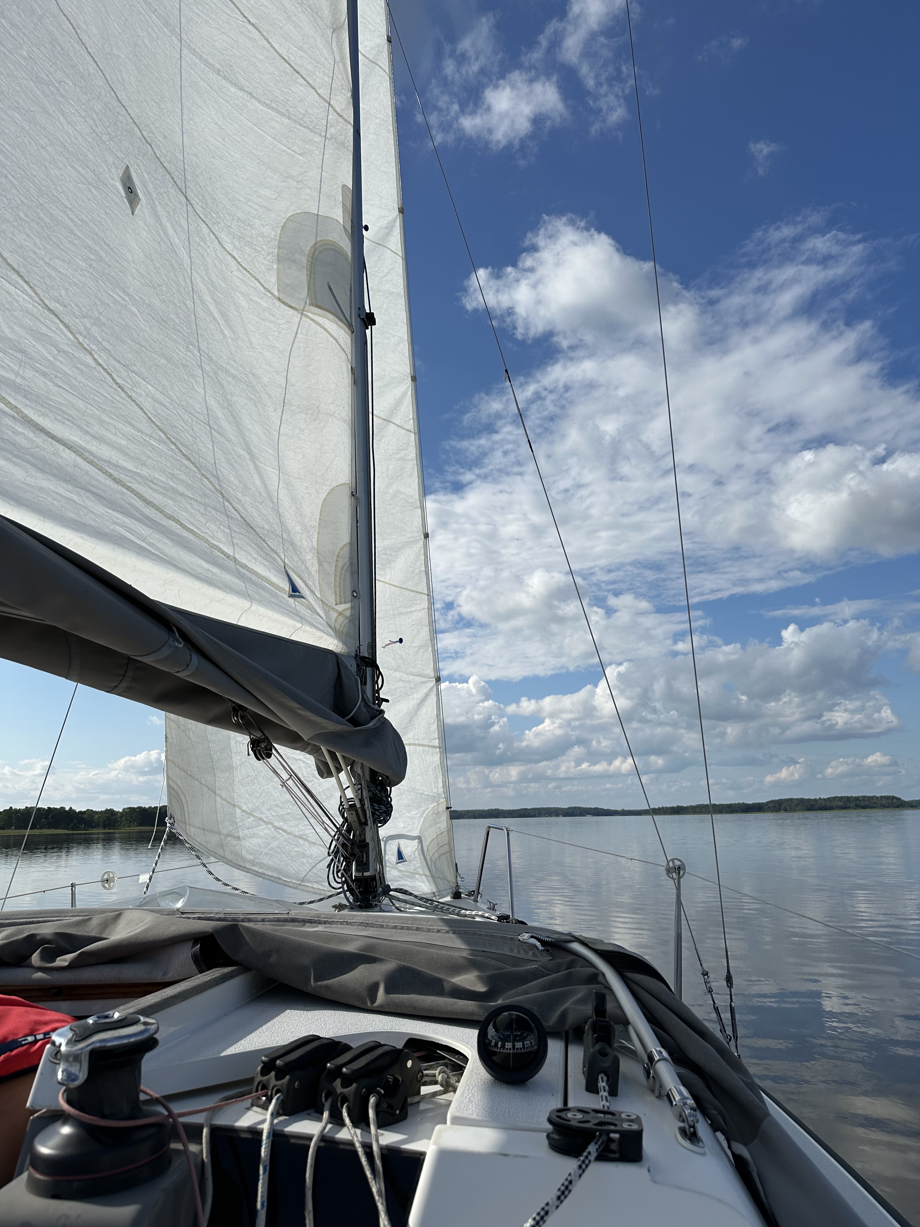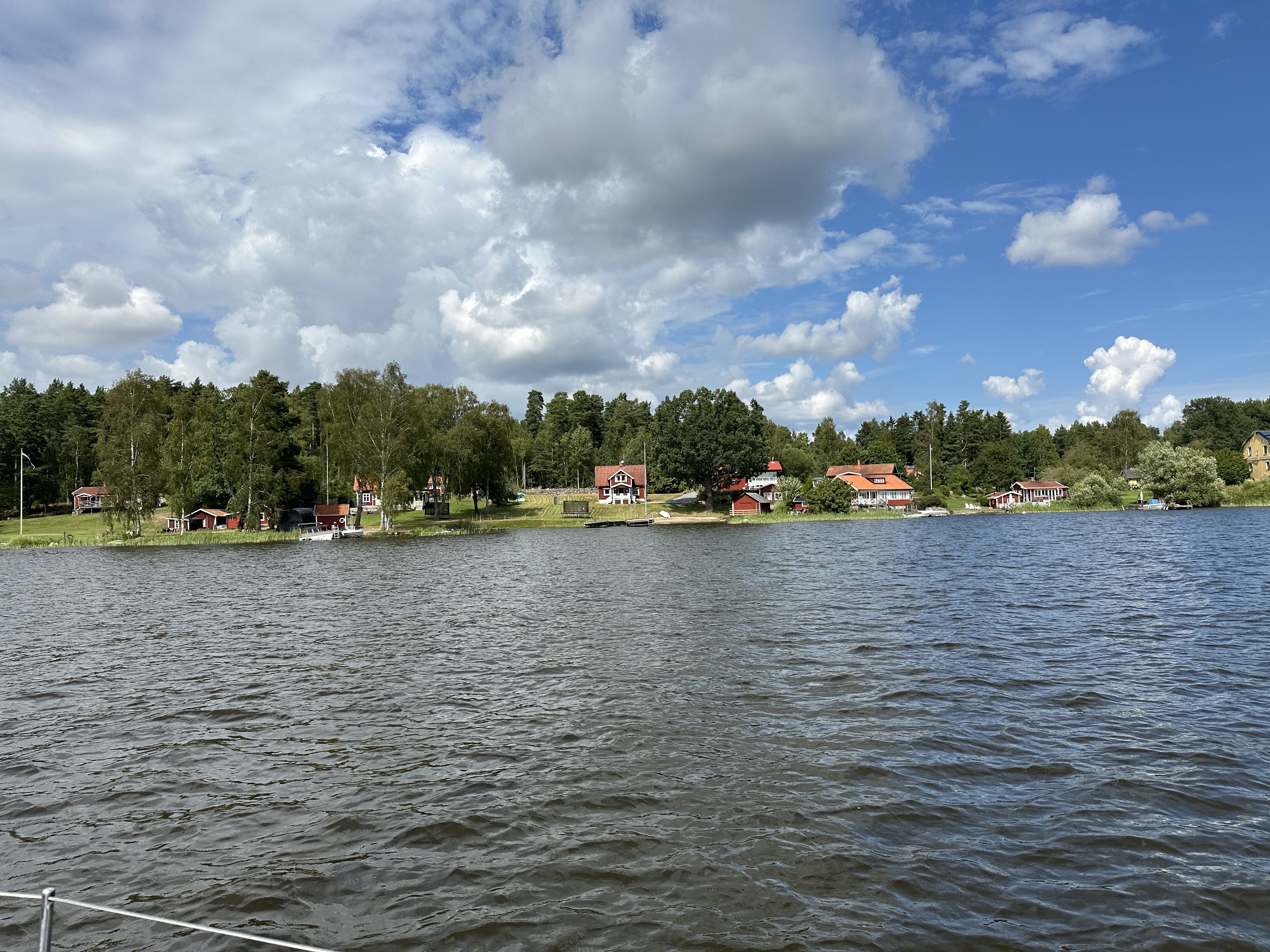 Strax efter 8.30 var vi redo och lämnade gästhamnen. Vinden var fin, och strax efter Kalkudden satte vi segel och länsade/slörade i cirka 3-6 m/s tills vi kom fram till inloppet mot Stallarholmen. Där tog vi ned seglen eftersom det såg trångt ut på sjökortet och vår båt kan bli lite svårstyrd om det trycker på med mycket vind på vissa bogar. Det visade sig ändå vara rätt val eftersom vinden mer eller mindre dog när vi kom in under land (vilket också var vad vi hade gissat på).