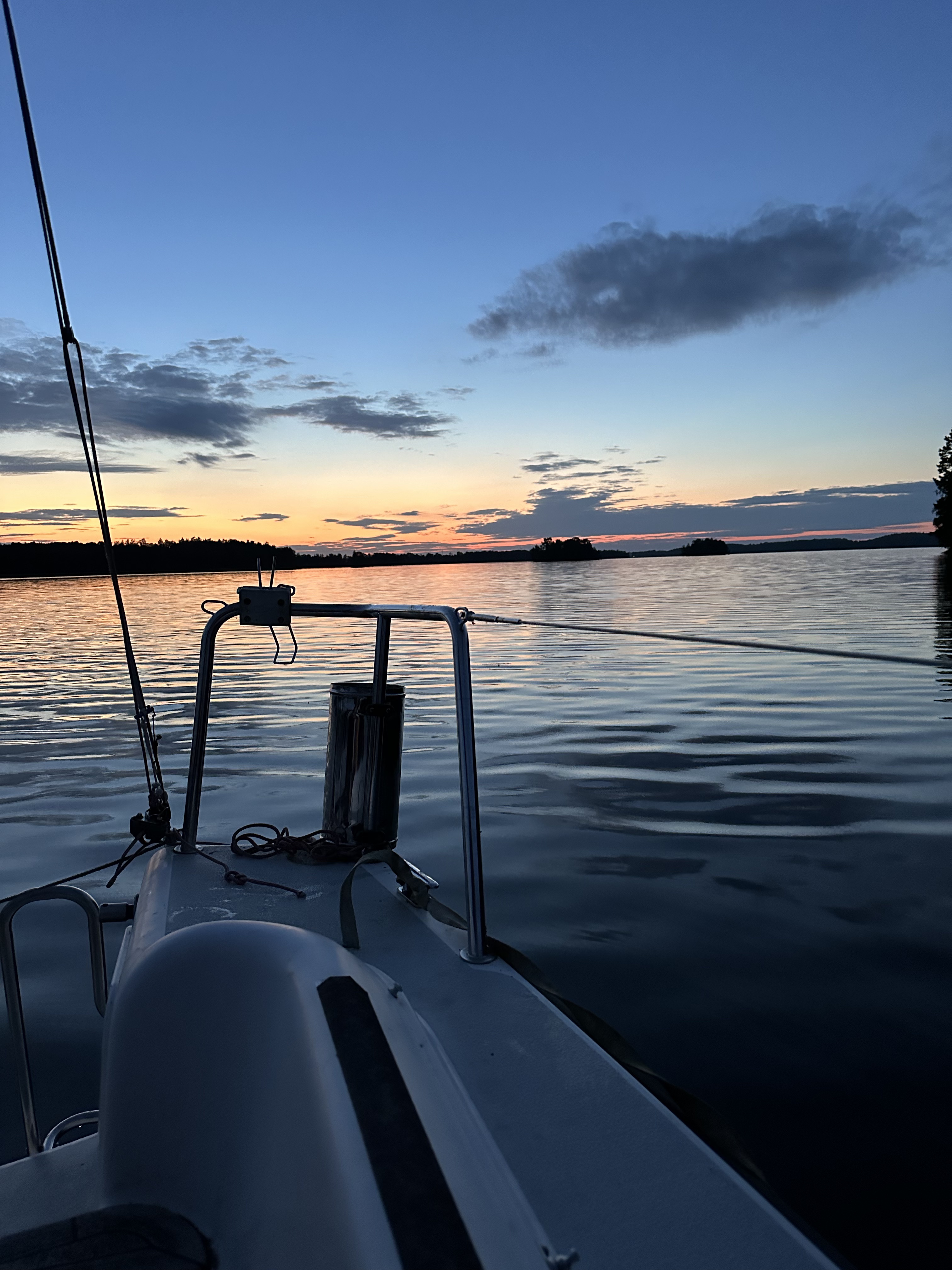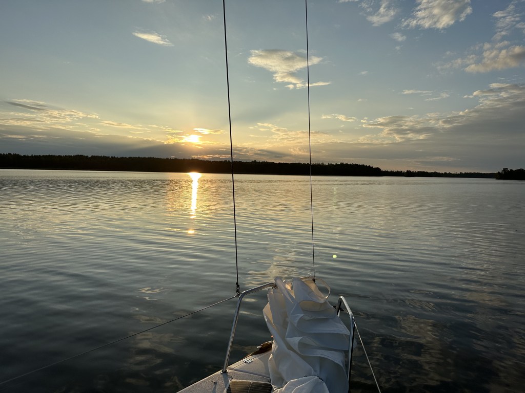 Så himla fint att sakta glida fram mellan öarna och nästan öde var det, vi mötte väldigt få båtar. Häromkring har kaptenen inte så bra koll på var man kan lägga till men vi siktade på Granskär. När vi väl kom fram så ångrade vi oss, vi hade passerat så mysiga vikar på vägen så vi vände tillbaka en liten bit och låg på svaj innanför Nybbleholm. Ganska snabbt insåg vi att vi ankrat precis utanför en bäverhydda! De simmade längs vassen och tjattrade med varandra hela natten. Förutom bävrarna var det helt lugnt och tyst hela natten. Himla skönt att inte behöva oroa sig för att ankaret har släppt. Vi låg också perfekt för både solnedgång och soluppgång.