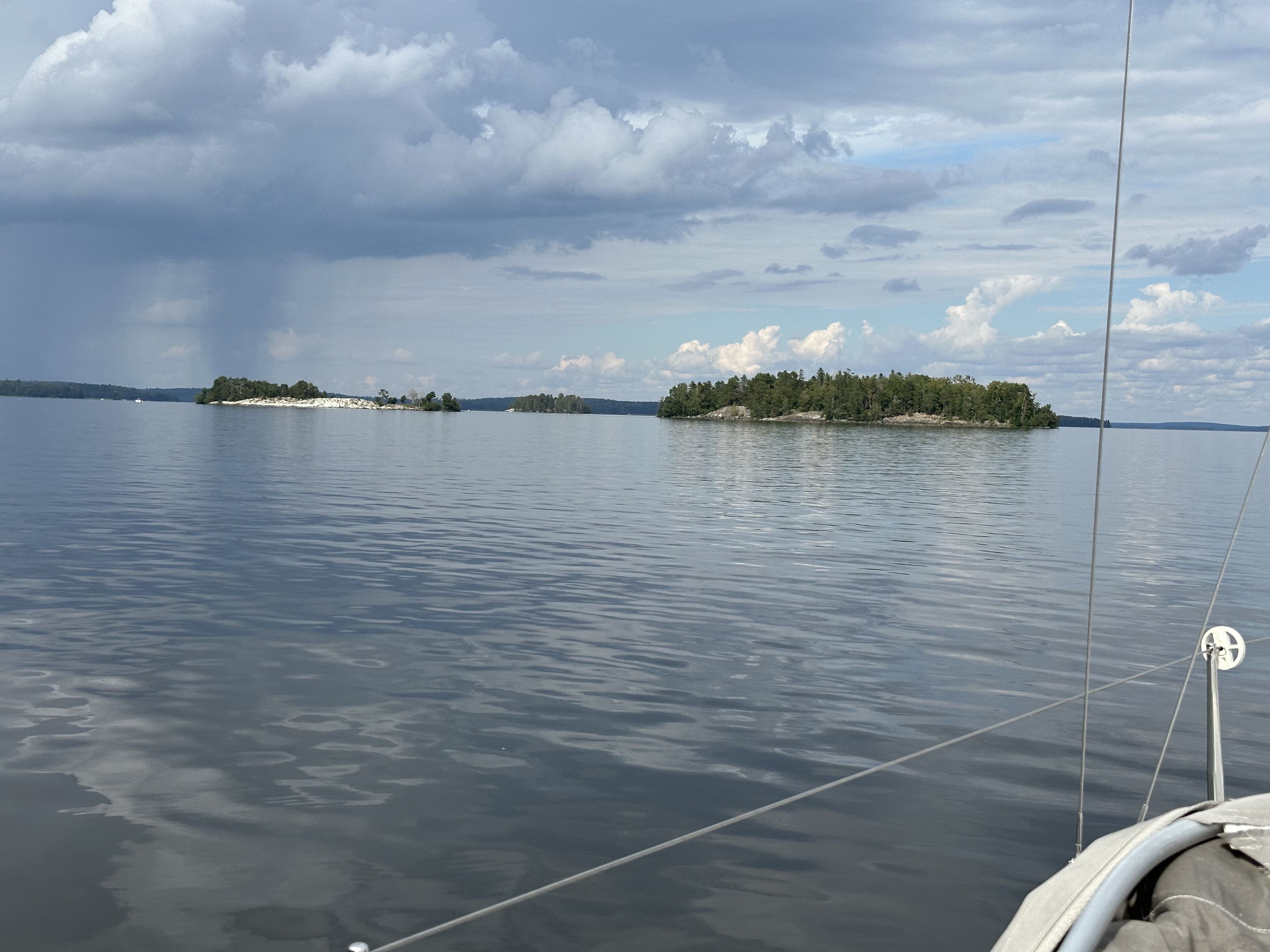 Vi kom över fjärden och en liten bit till, sedan såg jag hur vi mötte regnet. Jag drog på mig sjöstället och Magnus och Albin tog skydd i ruffen, sedan tuffade vi fram i ösregnet. Med elmotor och bra kläder var det ändå rätt behagligt.