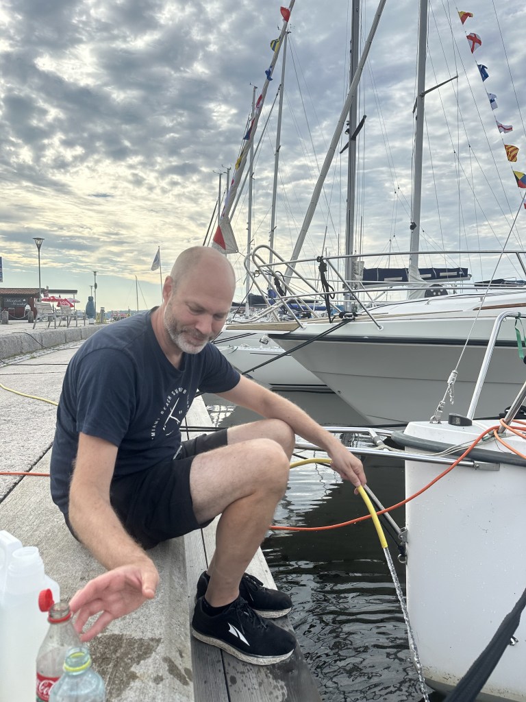 Det har gått åt mycket dricksvatten i värmen, så vi passar på att fylla upp alla dricksflaskor med färskt vatten.