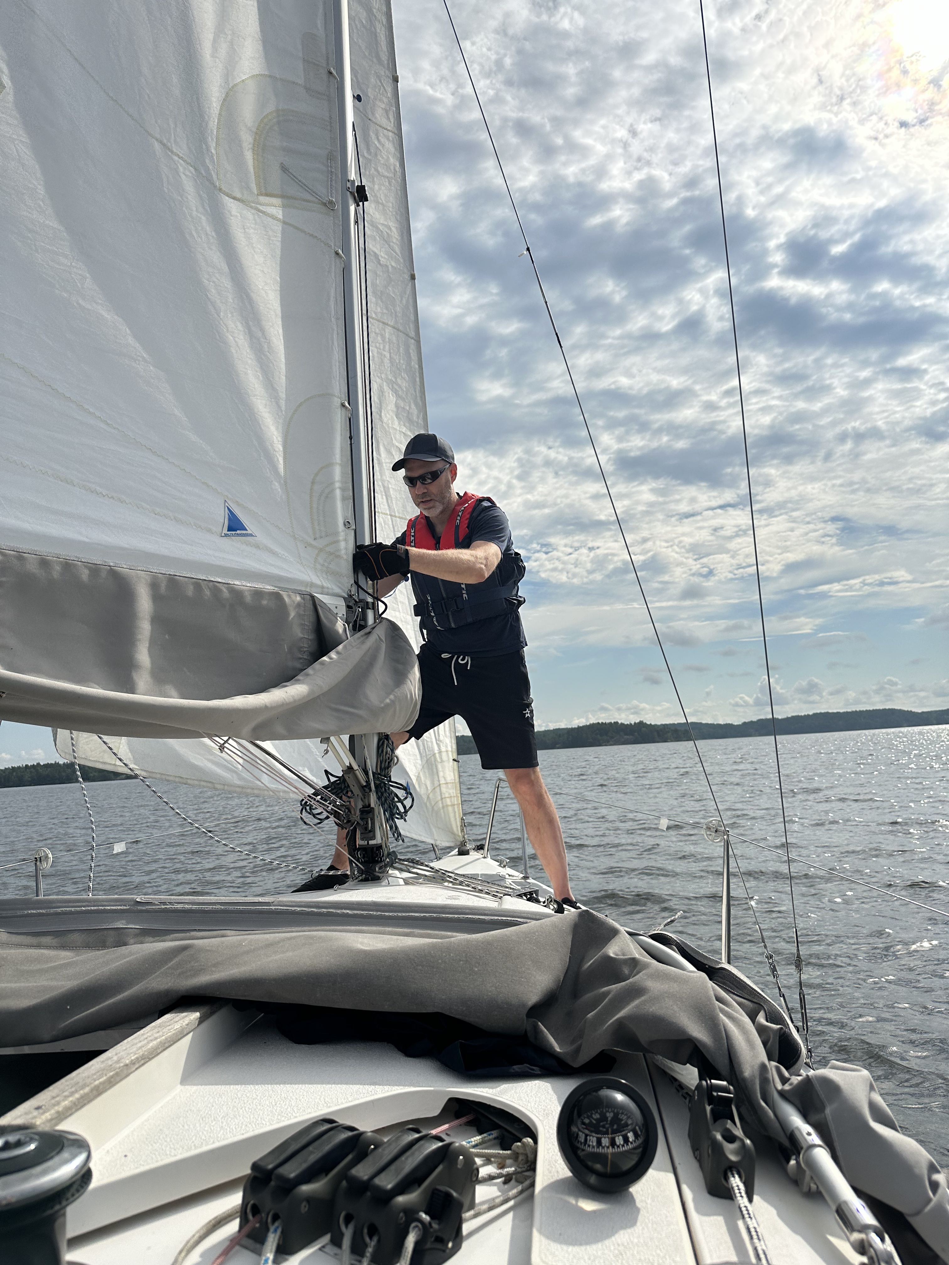 Naturligtvis hade vi glömt att fixa de där travarna när vi låg i hamn, men i det lugna vädret kunde Magnus göra det under gång (man måste skruva bort en del på masten som man verkligen inte vill tappa i sjön). Vi kunde också justera tamparna till vår lazy jack, som störde seglet, vi skulle behöva knyta om dem helt men då behöver vi helst ta ner masten och det gör vi inte nu när vi har båten hemma vintertid så den här lösningen får fungera tills vidare.