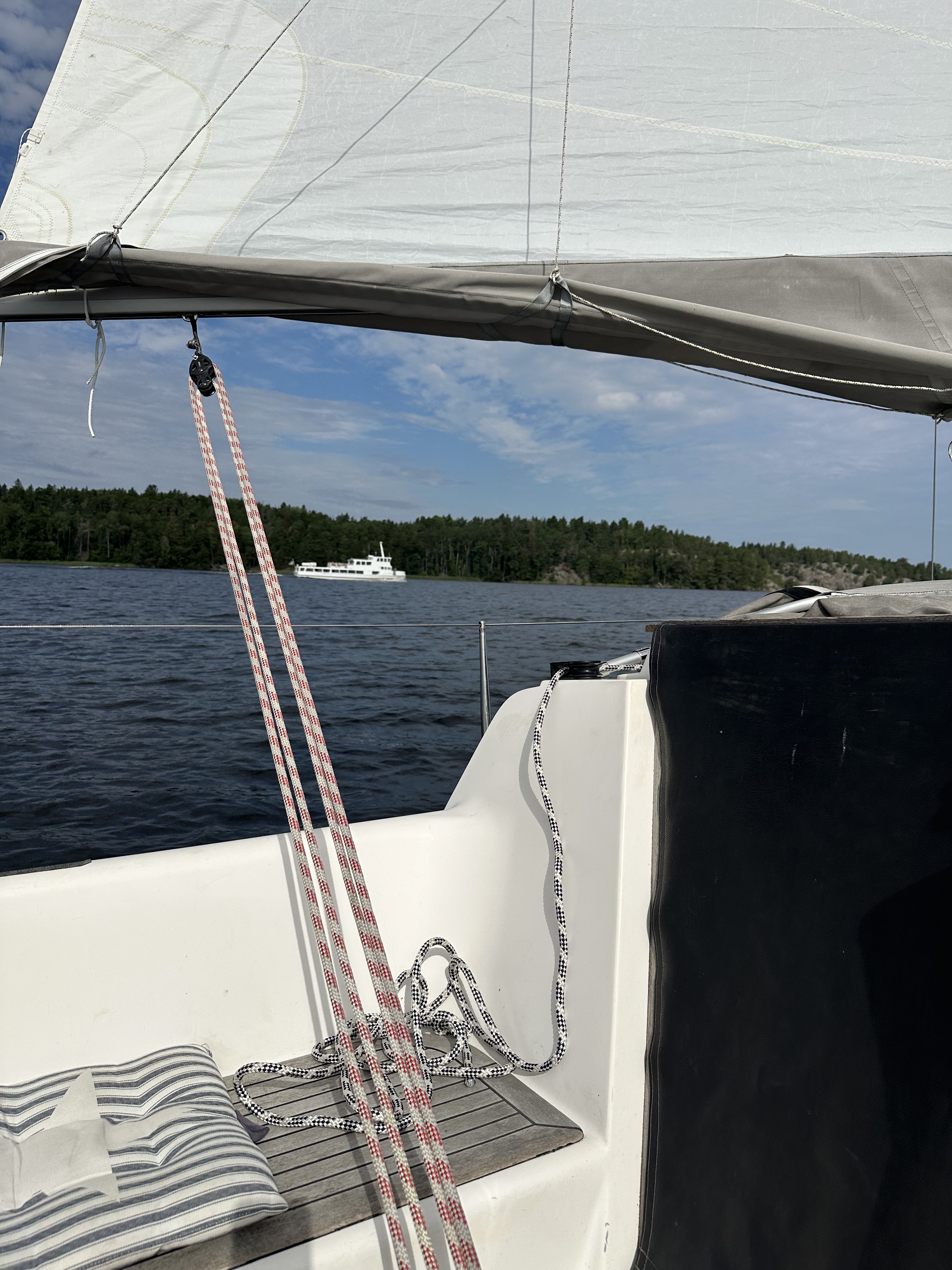 Den vanliga fördelningen vid segelsättning, jag står vid rodret och M hissar.Vi blev omkörda av färjan som jag antar är på väg till Birka