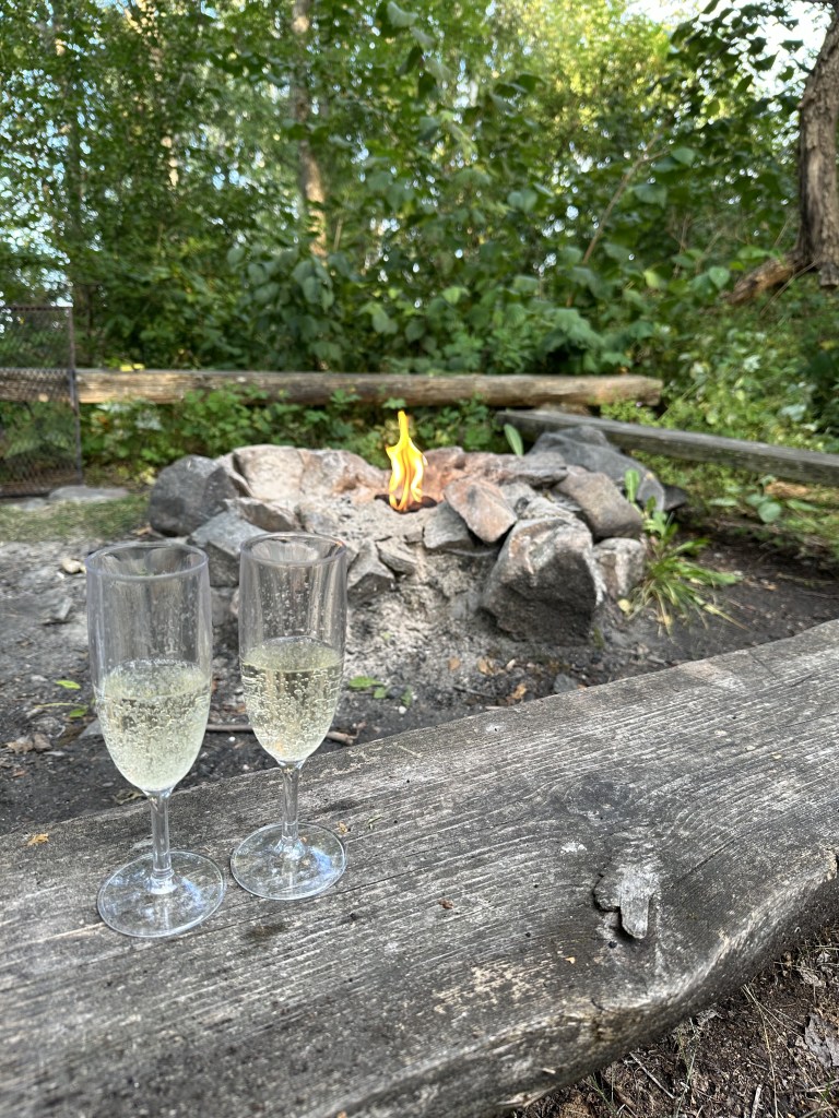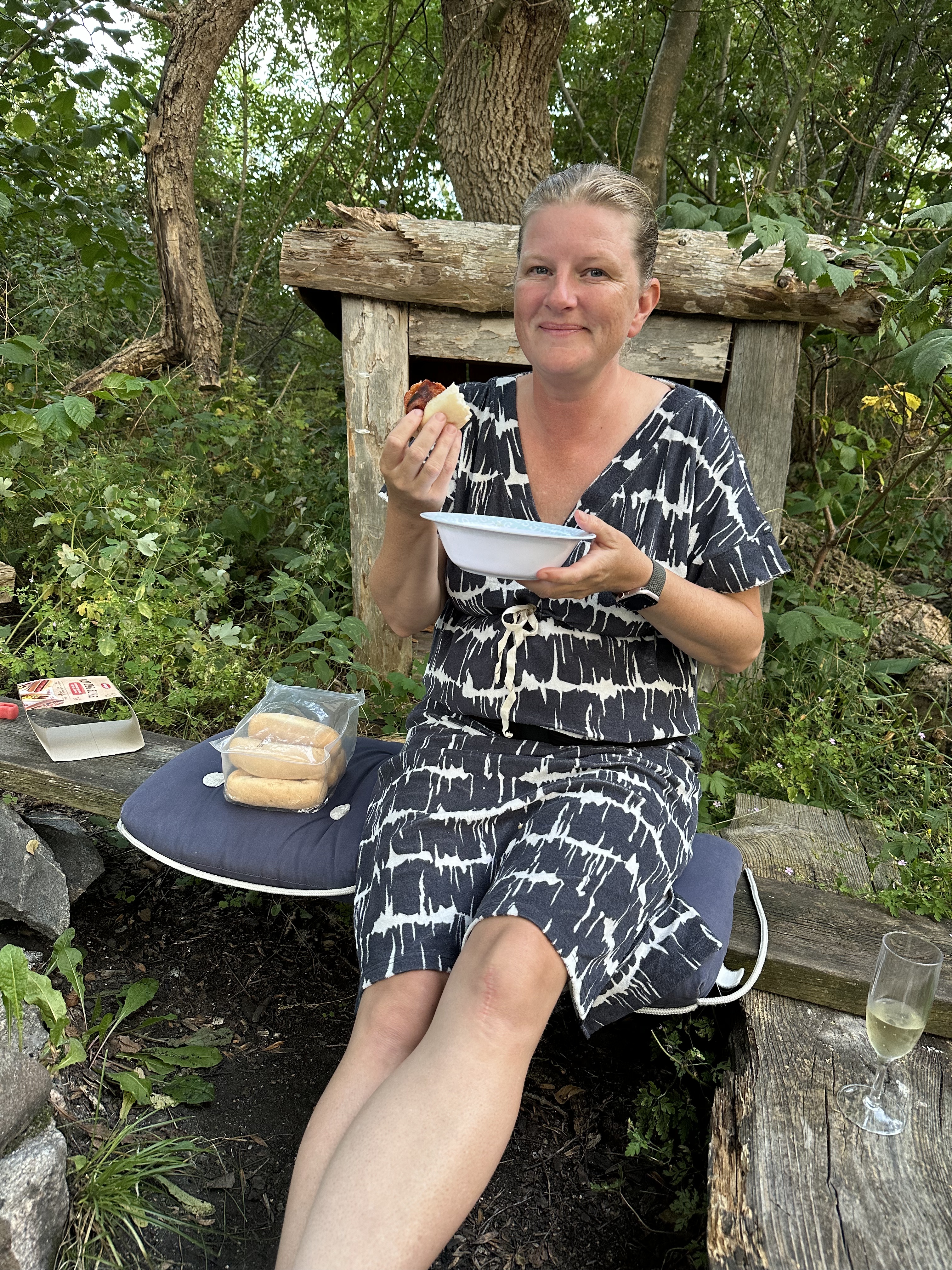 Vi var så nöjda med att det fanns en eldstad! Vi hade nämligen tagit med kol, men ingen grill. Grillen tar så mycket plats och det är knöligt att stuva den när den är använd, så vi tänkte att vill vi grilla så får det bli på en klubbholme eller liknande där det oftast finns grillar. Nu blev det glamping igen! Vilken lyx och ynnest att få ha en vik helt för sig själv, med naturen så nära och ändå bekvämligheter som brygga och grillplats. I väntan på glöden hällde vi upp vår lilla flaska bubbel och skålade för en lyckad båtsemester! Den grillade chorizon smakade lika gott som lyxmiddagen på värdshuset kvällen innan.
